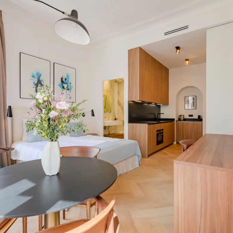 Renovated in 2024 by the acclaimed M-P Design, this luxury studio blends modern Scandinavian elegance with the feel of a 5-star boutique suite. High ceilings, large windows, walk-in closet and a clever layout make this 29 m² apartment feel spacious and functional and in additions provides a southeast facing balcony with space for table and 2 chairs – just perfect for short-term rental guests.