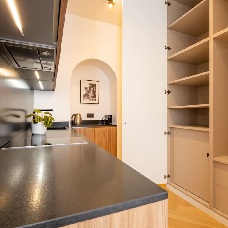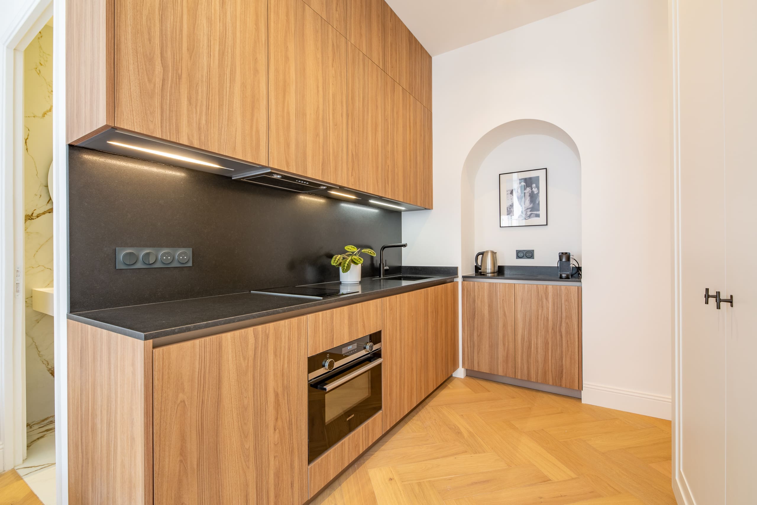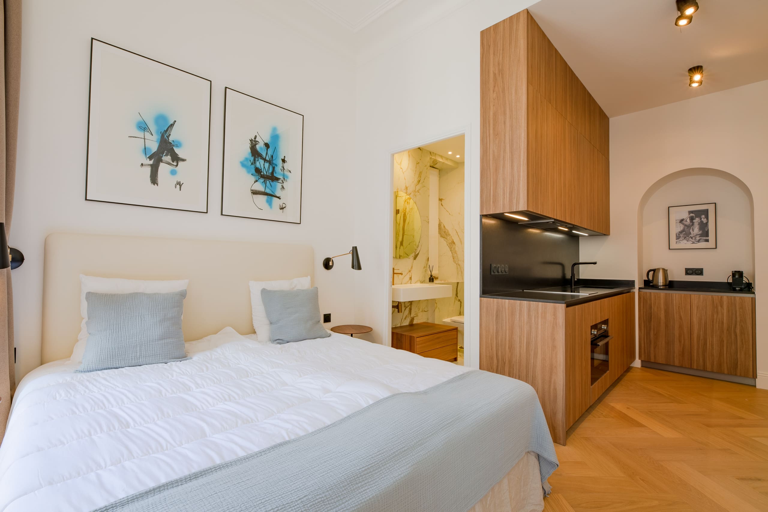 Renovated in 2024 by the acclaimed M-P Design, this luxury studio blends modern Scandinavian elegance with the feel of a 5-star boutique suite. High ceilings, large windows, walk-in closet and a clever layout make this 29 m² apartment feel spacious and functional and in additions provides a southeast facing balcony with space for table and 2 chairs – just perfect for short-term rental guests.